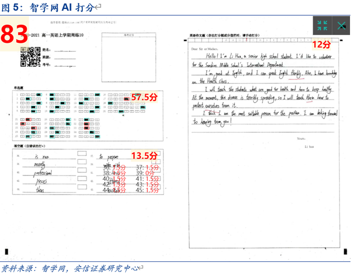 凭借强大的图像识别技术,智学网能够自动识别教师上传的学生答卷,进行分数标注,自动生成学生总分,并传入后台数据库,进行“点对点”学生学习情况的统计分析。根据草根调研,智学网针对非客观题,如高中英语的完形填空进行的自动批改准确率较高,并能够检查出英语作文中一些基本语法错误,大大减少老师作业批改时间。