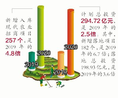 2020年全市现代农业招商项目共289个,总投资394.66亿元,推动夏商新希望、元初食品新零售等192个项目落地。