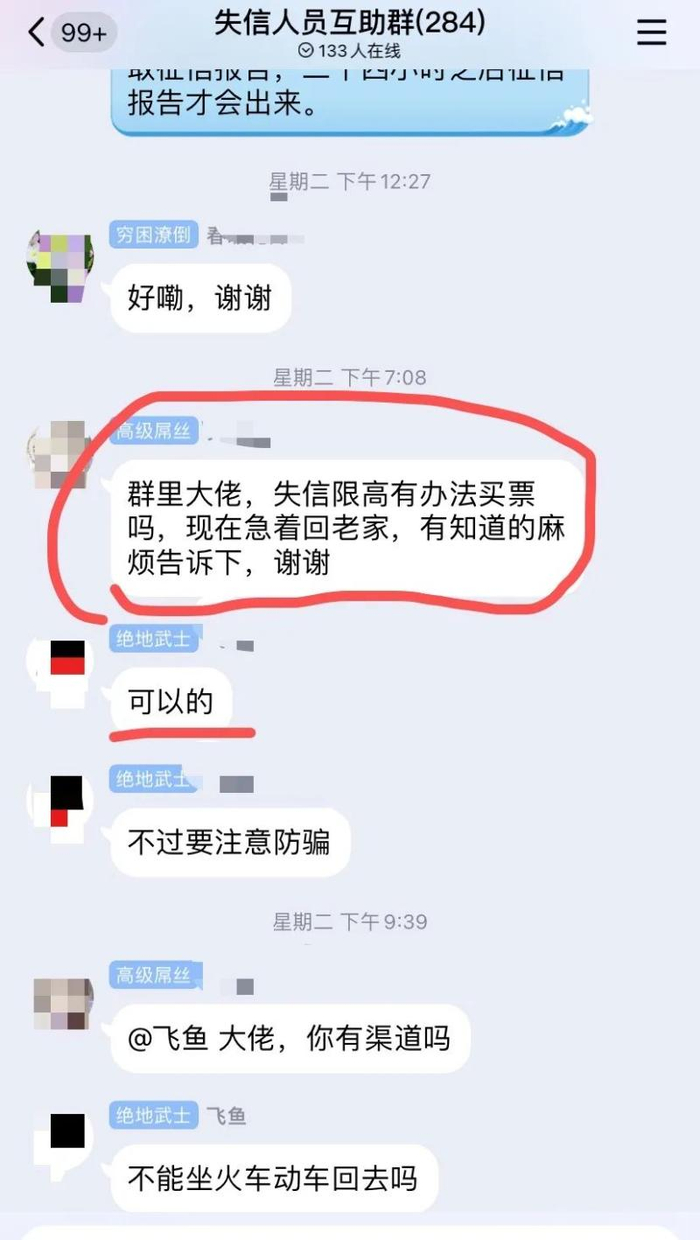 记者加入的多个“失信限高人员互助交流”QQ群中,群中不时有人咨询“限高”人员如何乘坐高铁或飞机出行,也有人打出广告,声称可以解决出行受限问题,寻觅客户。