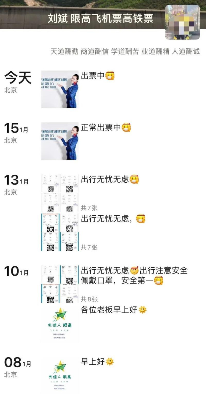 澎湃新闻记者注意到,微信账号名为“刘斌-限高飞机票高铁票”的“黄牛”在网上发布广告网帖称,为“限高”人员提供订机票的服务。