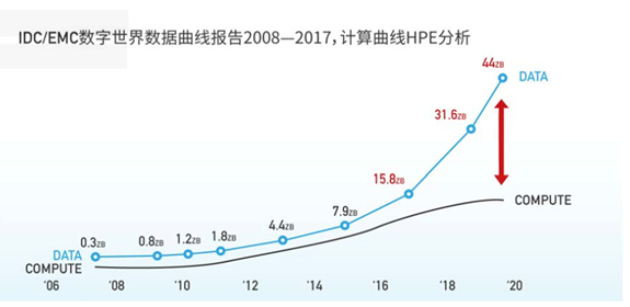 1992年,全人类每天只产生100GB数据;今天全球70亿人,每人每天产生的数据高达1.5GB,仅一辆自动驾驶汽车,一天就能产生64TB数据,足以填满32块硬盘。据IDC和EMC统计,近10年来全球算力的增长明显滞后于数据的增长。