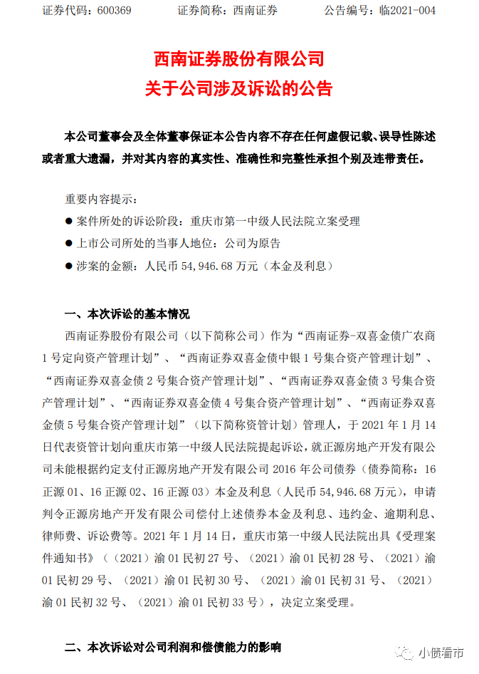 公告显示,正源地产未按约定支付“16正源01”、“16正源02”、“16正源03”本息5.5亿元,西南证券申请判令其偿付上述债券本金及利息、违约金、逾期利息、律师费、诉讼费等,且目前重庆市上述法院已出具《受理案件通知书》,决定立案受理。