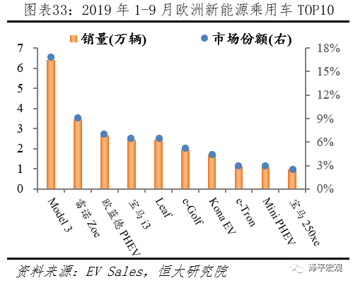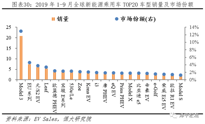 TOP20车型中国占有9席、欧盟占据5席、特斯拉全系上榜、Model 3一枝独秀。据EV Sales统计,2019年1-9月全球新能源乘用车TOP20车型销量从高到低依次为:Model 3、EU系列、元/S2 EV、Leaf、欧蓝德 PHEV、宝骏 E系列、530e/Le、Zoe、Kona EV、宝马i3、唐 PHEV、eQ EV、PriusPHEV、Model X、比亚迪e5、帝豪 EV、e-Golf、荣威 Ei5 EV、欧拉 R1 EV、Model S;对应销量20.80、7.43、6.08、5.38、3.86、3.73、3.68、3.52、3.30、3.06、3.00、2.96、2.87、2.86、2.84、2.73、2.54、2.35、2.26、2.05万辆;其中中国9款,美国3款,日本2款,欧盟5款,韩国1款。