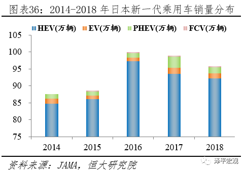 日本新一代汽车HEV占据统治地位。日本由于发动机技术领先,发展HEV有天然优势,故将HEV纳入新一代汽车体系,与EV和PHEV共同发展。据日本汽车销售联合会(JAMA)披露,2018年日本乘用车新车HEV、EV、PHEV、FCV、传统车销量分别为92.18、1.46、1.88、0.06、193.97万辆,分别占比66.99%、31.84%、0.65%、0.50%、0.02%。