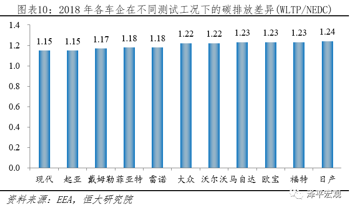3)测试标准更严:2021年开始执行WLTP测试标准,相比NEDC测试标准而言,WLTP测试标准测试距离长、周期多、速度快,更接近实际。根EEA发布的2018年欧盟乘用车测试数据显示,WLTP标准下乘用车碳排放相比NEDC平均高出21%左右,主流车企测试结果显示高出15%-24%。