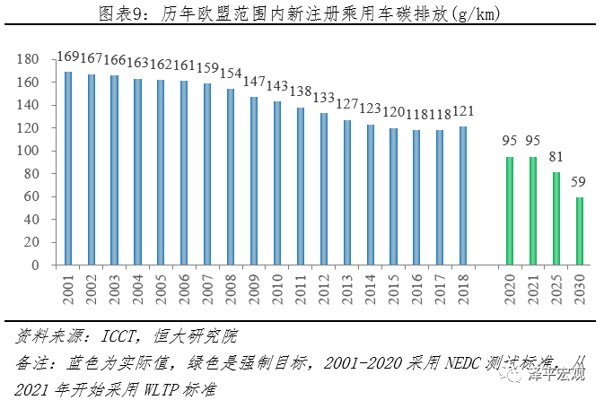 1)目标值降幅大:2021年开始采用新测试标准WLTP,乘用车排放不得高于95g/km,2025年、2030年分别在2021年基础上减少15%、37.5%。据国际清洁交通委员会(ICCT)披露,欧盟乘用车企实际碳排放从2001年169g/km下降到2018年121g/km,年均降幅仅1.9%。