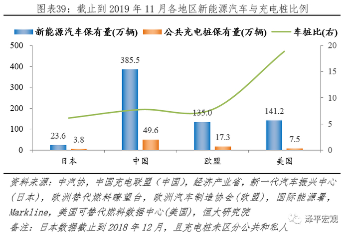 截止到2019年11月,据中汽协、中国充电联盟统计,中国新能源汽车、公共充电桩保有量分别为385.5万辆、49.6万个,对应车桩比7.77:1;据ACEA、欧盟替代燃料瞭望台统计,欧盟新能源汽车、公共充电桩保有量分别为135.0万辆、17.3万个,对应车桩比7.78:1;据Markline、美国可替代燃料数据中心统计,美国新能源汽车、公共充电桩保有量分别为141.2万辆、7.5万个,对应车桩比18.88:1。截止到2018年12月,据日本经济产业省披露,日本新能源汽车保有量23.6万辆;据新一代汽车振兴中心披露,充电桩保有量3.8万个,对应车桩比6.15:1。