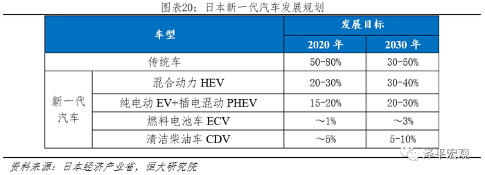 2020年、2030年新能源汽车分别占比15-20%、20-30%。2010年4月日本经济产业省发布《下一代汽车战略2010》,将下一代汽车定义为:非插电式混合动力汽车(HEV)、纯电动汽车(BEV)、插电式混合动力汽车(PHEV)、燃料电池汽车(FCV)、清洁柴油汽车(CDV)等。并首次公告发展目标:到2020年,下一代汽车将在新车销量中力争达到20%~50%;到2030年,下一代汽车将在新车销量中力争达到50%~70%,并沿用至今。