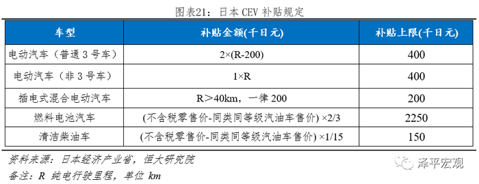 新能源财政补贴由经济产业省主导,分为四类:1)节能车补贴;2)CEV(CleanEnergy Vehicle)导入补贴;3)充电设施补贴;4)加氢设备补贴。其中节能车补贴于2012年9月废除,被CEV补贴取代;加氢设备补贴主要针对氢燃料电池,充电设施补贴主要针对充电桩,当前新能源汽车主要推动力在“CEV导入补贴”。2012年6月日本举行行政评议会审议了“CEV导入补贴”,并制定具体路线图,实施机构为隶属于经济产业省的“新一代汽车振兴中心”,最新规定如下表所示,电动车补贴与纯电续航里程正相关。并要求:1)消费者获取CEV车辆补助后,必须持有该车3-4年,如果不得已需要卖出须提前向中心申请;2)公式计算结果补助金不足15千日元的,不给予补助;3)当EV/PHV与汽油车的价格差缩小至50万日元,且年销量增加至10~15万辆时,将不再作为补贴对象。