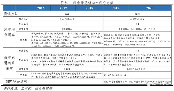 1)传统燃油车油耗趋严,鼓励发展低油耗车型。新《积分办法》将传统燃油车测试方法从NEDC调整为WLTC工况,中汽中心数据显示其油耗将较NEDC工况恶化10.6%。此外,燃料消耗量目标值下调10%左右。2)NEV积分下调,比例要求提高。新《积分办法》要求,2021年至2023年新能源积分比例分别为14%、16%和18%,逐年上调2%。此外,单车积分公式变化,同等技术条件下纯电动和燃料电池汽车积分减半。积分上限做出调整,纯电动、燃料电池和插电混动积分上限分别调整为3.4、6和1.6分,较当前办法变动-32%、+20%和-20%。3)NEV积分允许结转,延续中小企业考核优惠。之前由于NEV积分无法结转,削弱了发展新能源汽车积极性。新《积分办法》允许19年NEV正积分等额转接,20年正积分按50%比例结转,一定程度上增加NEV积分结转与交易灵活性,助推传统车与新能源车同步发展。