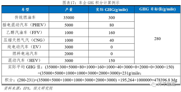GHG标准采用积分制管理。EPA每年发布年度各车企GHG报告,对各车企积分进行公示,产生负积分的企业需要购买GHG正积分进行冲抵。GHG积分=(GHG目标值-GHG实际值)×产量×全生命周期里程÷1000000。其中全生命周期里程:乘用车为195264英里;积分单位:Mg(megagrams兆克)。假设:车企A年产50000辆乘用车,各车型产量分布如下,则计算可得该年实际积分为:478396.8Mg。