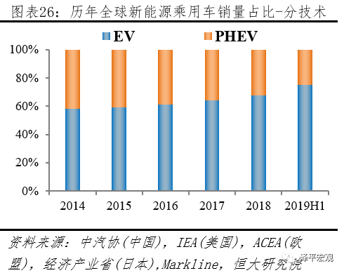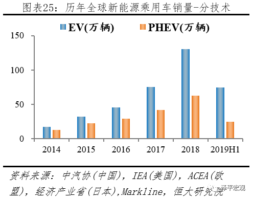 2019H1全球新能源乘用车市场EV占比3/4,份额持续提升。2019H1新能源乘用车市场,据中汽协披露,中国EV、PHEV分别销售44.0、12.3万辆;据ACEA披露,欧盟EV、PHEV分别销售12.5、7.2万辆;据Markline披露,美国EV、PHEV分别销售10.6、3.1万辆,日本EV、PHEV分别销售1.1、0.7万辆,其它地区EV、PHEV分别销售6.2、1.2万辆。按上述统计,2019H1全球新能源乘用车市场,EV、PHEV分别销售74.4、24.6万辆;EV市场份额从2014年58.4%提升到2019上半年75.2%。