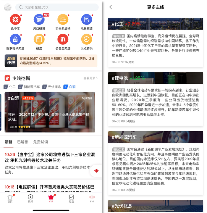 主线挖掘:A股市场当下主线是什么?投资逻辑是什么?受益板块个股有哪些?长期投资还是短线炒作?进入新版「VIP频道」首页,市场主线、投资逻辑、催化周期、受益个股等便一目了然。点击进入主线专题,不仅可以查看与主线最相关的精选VIP资讯,还可以通过追溯历史资讯把握主线催化的节奏。