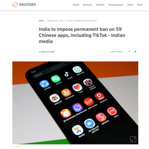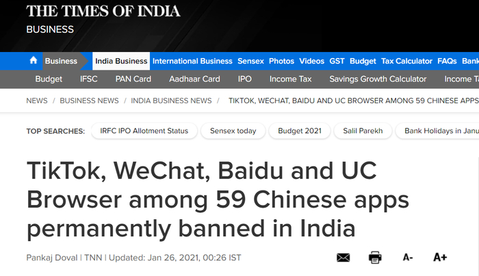 《印度时报》在报道中也提到此事称,自去年6月起,印度政府已对267款应用程序(不同批次)采取了“前所未有的”行动。印度电子信息技术部去年6月29日宣布,禁止包括TikTok、微信、微博在内的59款中国应用。7月28日,印度电子信息技术部称印度政府已决定开展第二轮禁用中国网络程序的决定,该禁令涉及47个中国公司开发的程序。同年9月2日,印度电子和信息技术部又发布公告,宣布禁用百度搜索等118款中国手机应用程序。之后的11月24日,印度电子和信息技术部再次发布公告,宣布禁用全球速卖通、钉钉等43款中国背景手机应用程序。
