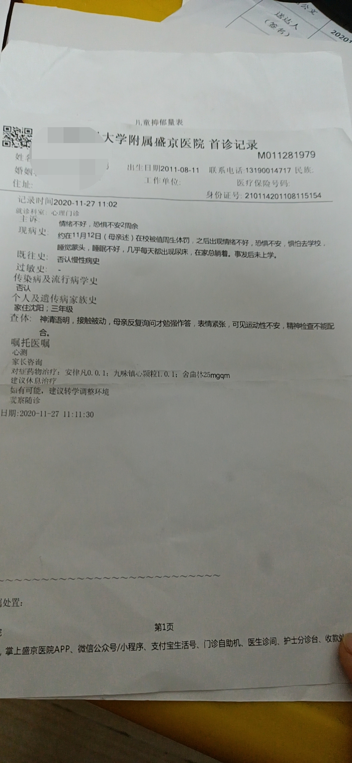2020年11月15日,郑女士带着聪聪求医,因为需要预约,直到11月27号,才在中国医科大学附属盛京医院挂上号,经查,确诊为”重度抑郁症“,并建议“转学调整环境”。