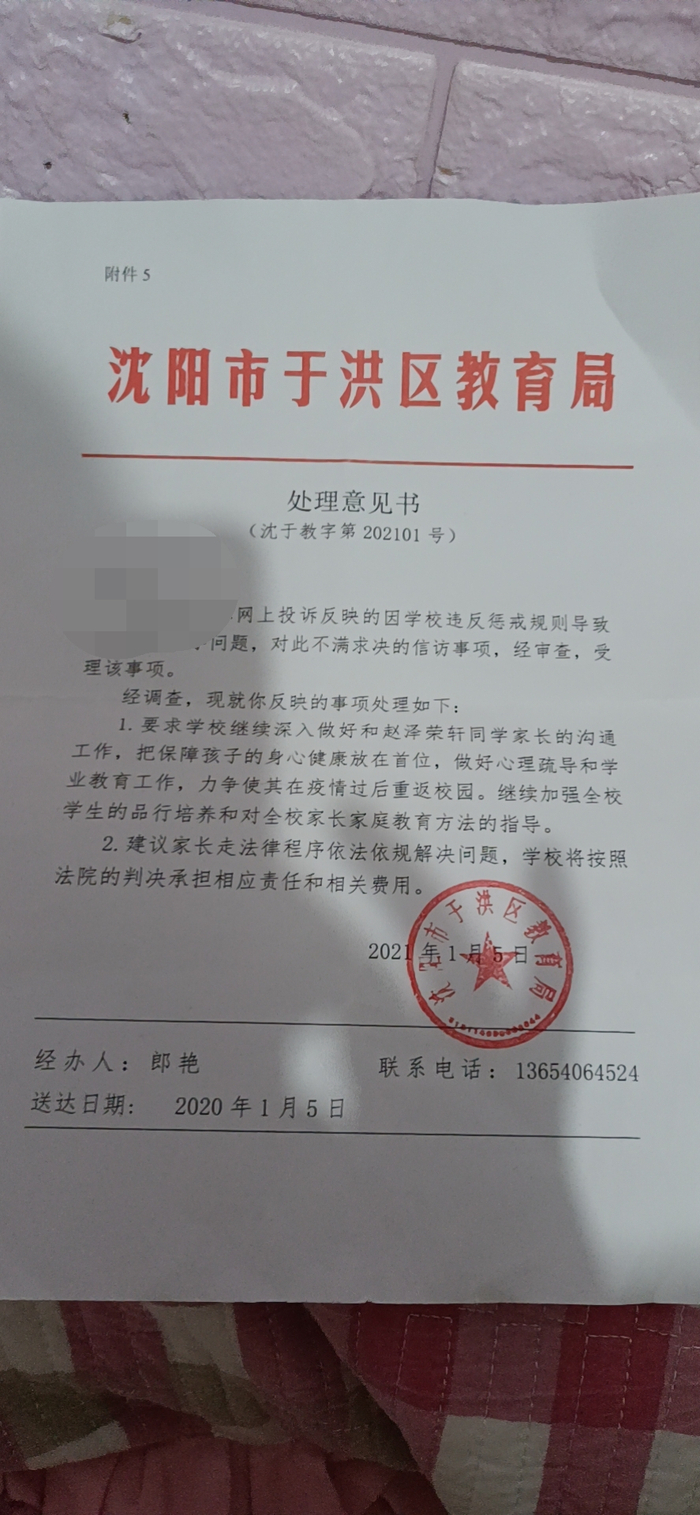 2021年1月6日,区教育局一位工作人员向聪聪父母传达了《处理意见书》,并称是“教育局的最终处理结果”。