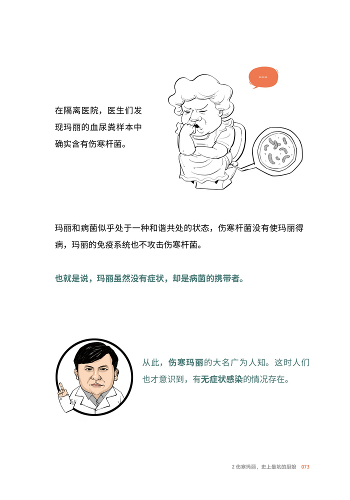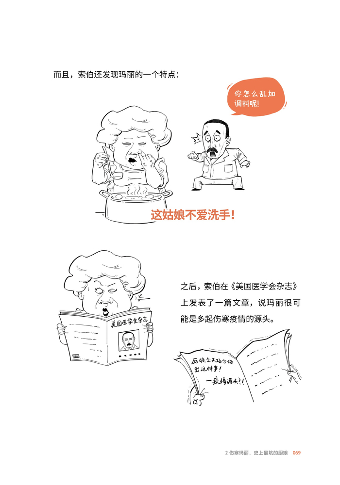如书中的第二章《伤寒玛丽,史上最坑的厨娘》就讲述了一个“无症状感染”的厨娘不爱洗手,几乎将所有雇主一波带走的故事:1906年夏天,纽约银行家华伦开心地带着老婆孩子外出度假。但没开心几天,他的妻子、两个女儿、一个园丁相继染上了一种烈性病。医生告诉他,他们患的是伤寒。这病没啥好办法,只能生扛,扛不过就要say goodbye……着急的华伦医生赶紧找来了一个叫乔治·索伯的传染病专家,拜托他查清楚这件事。索伯了解了华伦一家的情况,并查阅了近几年的伤寒病例资料。