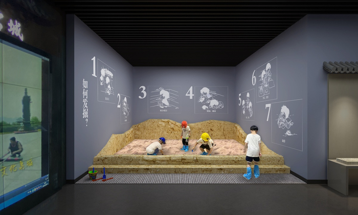 值得一提的还有本次展览的互动性。第二展厅设置成互动专区是此次展览的一项重要突破,丰富的互动活动改变了单一的参观方式,让观众能够充分参与其中,文物发掘互动区设置了模仿考古发掘现场的沙坑,同时在墙面介绍考古发掘的方法,家长们可以带领孩子体验一把现场寻宝的乐趣,在学习考古发掘知识的同时,更注重启发青少年自主探索的意识与能力;拓片制作体验互动区展示拓片制作教程的同时,一并设置操作台,由工作人员现场带领观众进行拓片教学和拓片体验。这也是博物馆在展览工作中对于如何探索教育的终身性、自主性、广泛性的积极回应。