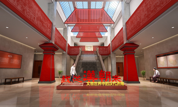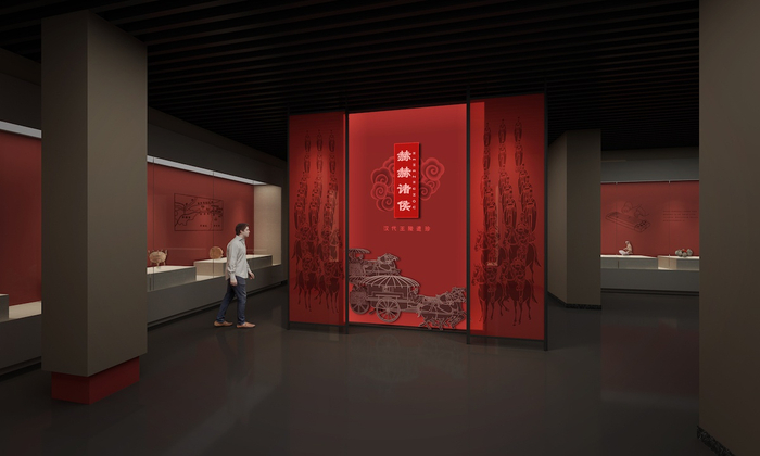 序厅效果图第一篇章“赫赫诸侯”讲述汉代王陵遗珍,展厅整体采用红色局部穿插黑色,营造出庄重而高贵的环境氛围。展标设计采用大红色立体落地灯箱、轻型装饰面层材料设计制作屏风分置灯箱左右两侧,形成立体虚实层次,画面中的云纹、车马出行剪影与两侧仪仗队形成一个完整的王侯车马出行场面,赫赫诸侯的威严与雄风立刻呈现在观众面前。车马剪影、仪仗队设计元素均选自长清孝堂山画像石形象,突显地域文化特色。展厅主墙面,一袭暗红色展板玉贯穿始终,五大王陵墓葬发掘现场照片,作为辅助展示内容,场面震撼,极具视觉冲击力。双乳山济北汉王陵出土的覆面是本次展览的重点展品,给玉覆面设计了独立展示空间,展柜上方增加了暗红色灯箱,隐藏的灯光集中照射玉覆面,让文物形象更加清晰灵动,成为观众聚焦打卡地。