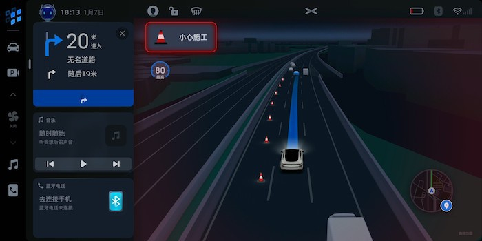值得表扬的是,NGP在变道时非常平滑顺畅,完全对得起“老司机”的称号,因为在自行变道时,乘坐者们甚至完全感受不到突兀感。而且,开启NGP后,小鹏P7的对外摄像头还能准确识别因路政人员临时修路而放置的临时桩筒,用“扯一扯”安全带的方式提醒驾驶者。