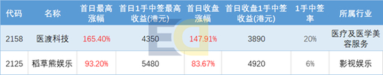 第二只“大肉签”是稻草熊娱乐,该股实际认购人数31.4万人,最终公开市场超购403.54倍,一手中签率6%。上市首日,稻草熊娱乐盘中股价一度高达11.36港元,较发行价上涨93.20%,不计算手续费,一手中签最高收益达5480港元;最终收盘价报10.80港元,涨幅高达83.67%,不计算手续费,一手中签收益达4920港元。