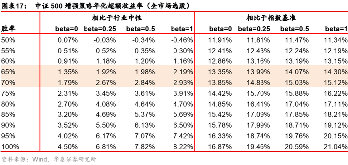 下文四张表格给出了沪深300/中证500场景下,指数内选股/全市场选股的增强效果,全面展示了不同胜率行业轮动策略带来的增强表现。此外,根据以往的实证经验,大多数相对有效的月频行业轮动策略的胜率均落在65%至70%的区间内,表格中也已高亮标注。