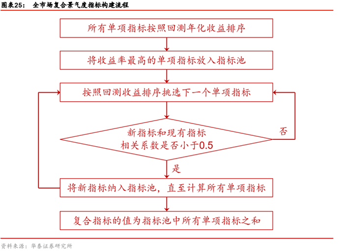 最后,每个单项指标相当于从特定角度对行业进行打分,将单项指标的打分汇总就得到复合指标得分。指标复合过程中,我们优先筛选回测收益较高的单项行业景气度指标,在此基础上控制纳入指标的相关性,保持最终入选的指标间相互独立,详细的构建步骤为:
