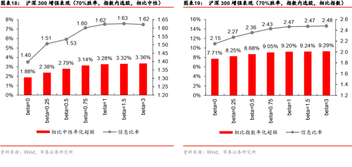 2.在相同的参数设置下,沪深300增强中,指数内选股的信息比率普遍高于全市场选股;而中证500则正好相反,全市场选股的表现显著优于指数内选股。由于测试过程中,针对指数内选股和全市场选股我们分别训练了不同的收益模型(也即一共有三个收益模型,分别是沪深300收益模型、中证500收益模型、全市场收益模型),从结果来看,全市场收益模型在沪深300中是有偏的,导致增强效果有限;在中证500中则适用性更强,而且利用了选股广度的优势,增强效果更显著。后文如无特殊说明,默认沪深300增强都是基于指数内选股,中证500增强则基于全市场选股。
