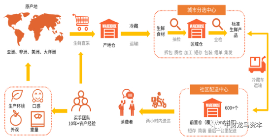 供应链:公司建立超新鲜超市的独特的供应链优势——源头直采,标准化,自有品牌。通过买手制,通过公司加农户的方式,与上游建立起良好的合作关系。