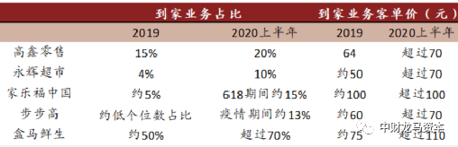 注:高鑫零售、永辉超市到家业务占比为公告披露数据,其余均为中金估算数据