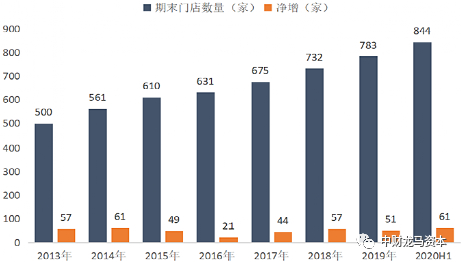 家家悦的门店目前主要集中在山东威海、烟台、青岛等地,此外在河北张家口也有所布局。2020年上半年,家家悦新增门店67家,其中包含并购淮北真棒的31家门店;而在2020年第三季度,家家悦新开门店33家,其中山东省19家,河北省6家,其他省份8家(其中内蒙古1家、安徽4家、江苏3家),不断加强区域渗透、完善全国门店布局。截至9月30日,家家悦门店总数已经跃升至874家。公司2017年初至2020年6月末门店总数分别631家、675家、732家、783家、844家,门店总数逐年增长。