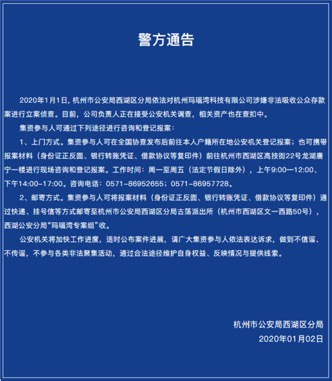 根据杭州西湖警方当初的通报,玛瑙湾被立案后,公司负责人接受公安机关调查,相关资产也在查扣中。在2019年12月8日,玛瑙湾官网曾公告宣布良性退出网络借贷信息中介业务。公告称,平台将在一个月内发布退出兑付方案,但之后一直未发布。直到等来警方立案的通报。根据玛瑙湾官网披露的数据显示,截至2019年12月8日,平台累计借贷417.76亿元,借贷余额为25.89亿元,逾期金额为0。