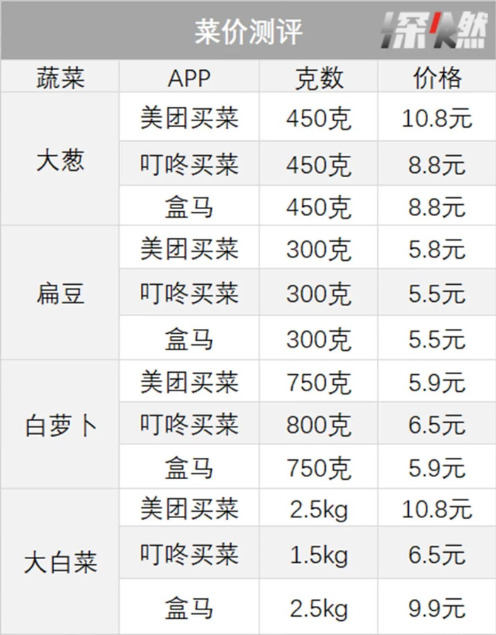 深燃从美团买菜、叮咚买菜、盒马鲜生三大生鲜电商平台挑选几样冬日里常见的平价蔬菜,发现如今的价格确实不平价。一斤大葱售价八九块,奔着十块钱去了,换算下来一根大葱要五六块;扁豆300克卖5.5元,相当于一斤的单价至少9块钱;原先几毛钱一斤的大白菜,也不再白菜价了,最便宜的也要两块钱一斤