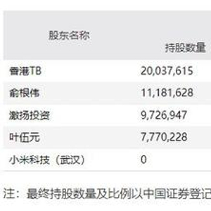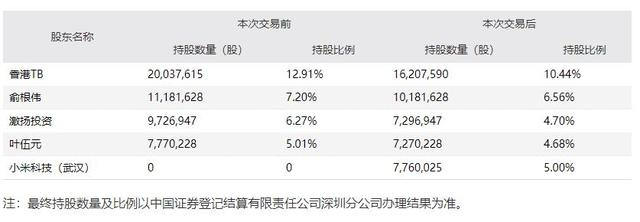 根据1月26日签署的《股份转让协议》,为引入战略投资者,上市公司持股5%以上的股东TB Material Limited(以下简称“香港TB”)、俞根伟、宁波激扬投资咨询有限公司(以下简称“激扬投资”)、叶伍元通过协议转让的方式,将所持合计5%的股份转让给小米科技(武汉)有限公司。