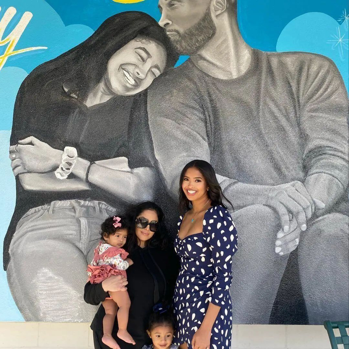 瓦妮莎带着三个女儿在科比和吉安娜的画像下合影。