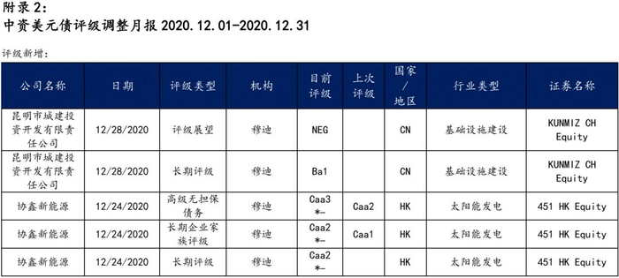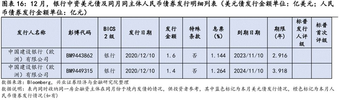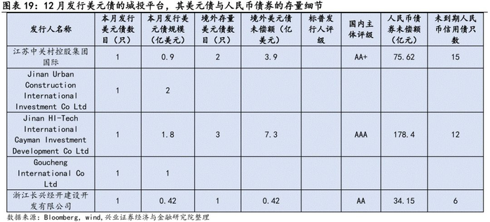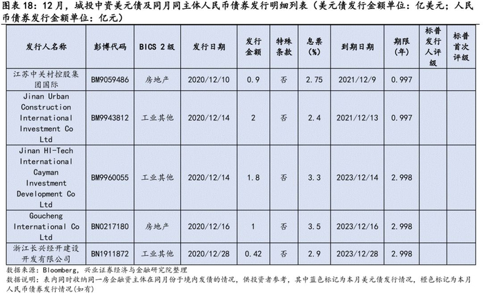 12月,银行业发行2只中资美元债;城投平台共发行5只美元债,环比有所减少。12月的2只银行美元债规模总计3亿美元,发行期限分别为3年和4年;2只债券收益率分别为1.144%和1.264%左右。12月的5只城投美元债规模总计6.12亿美元,发行期限在1-4年之间,债券发行利率分布在2.4%-3.5%。此外,所有银行美元债和城投美元债均无评级。
