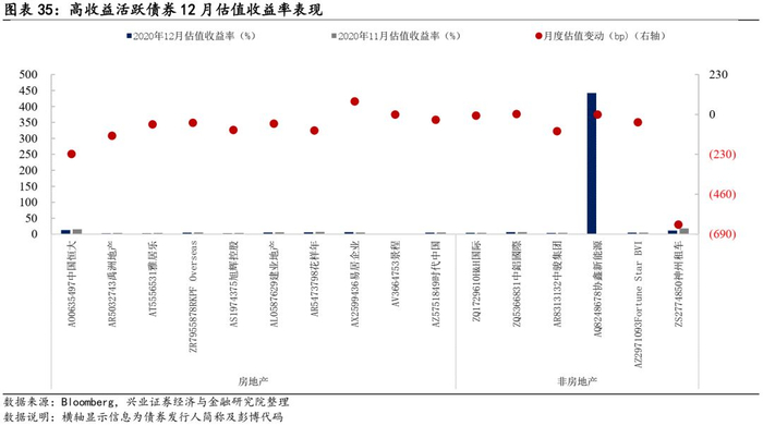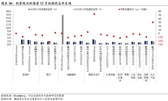 1)12月活跃的高收益中资美元债中,估值收益率超七成下行,个别个券调整幅度较大。分行业来看,地产活跃券估值收益率表现分化,其中“易居企业(代码:AX2599436)”为当月估值收益率波动上行的地产活跃券,月度整体上行74.98BP;“中国恒大(代码:AO0635497)”估值收益率波动下行幅度最大,月度整体下行227.96bp。非房地产行业的个券估值收益率多数下行,其中“中铝国际(代码:ZQ5366831)”月度整体小幅上行2.59BP;“神州租车(代码:ZS2774850)”估值收益率波动下行幅度最大,月度整体下行-634.84bp。