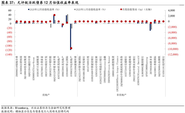 3)无评级中资美元债,12月估值收益率近七成下行。分行业来看,无评级的房地产债券估值收益率近八成下行,其中“弘阳地产(代码:AV8965270)”下行-9734.14BP,幅度最为显著,而“华夏幸福开曼(代码:AQ4243129)” 上行幅度最大,为2313.93BP;而非房地产行业的无评级活跃券中,超六成债券的估值收益率表现下行,其中下行幅度最大的为“拼多多(代码:ZR7993846)”,为-530.97BP。