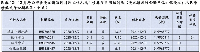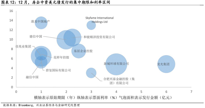 期限和票息方面,12月发行的12只房地产中资美元债中,发行期限差异较大,分布在1-6年,收益率方面分布在3%-13.50%,整体来看,房企通过中资美元债进行融资的期限选择依然也在分化。