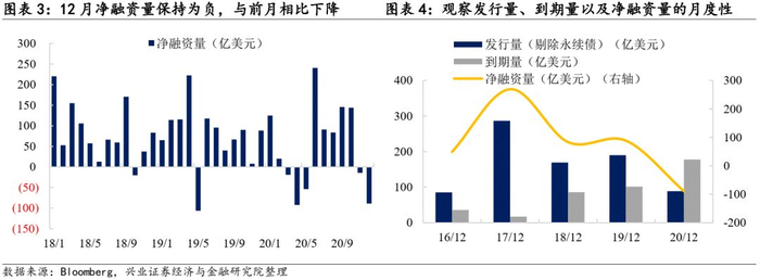 与前月相比,接近年末中资美元债发行量有所回落。具体来看,发行量方面,12月新发行债券规模99.03亿美元,环比同比均有所下降(前月182.17亿美元,去年同期214.43亿美元),其中永续债发行规模10亿美元。12月共发行45只债券,其中2只永续债。到期量方面,12月美元债到期规模环比同比均小幅增加(本月177.87亿美元,前月164.18亿美元,去年同期101.61亿美元)。净融资量方面,12月份净融资量(-88.85亿美元)较上月(-14.01亿美元)有所下降,较去年同期(88.33亿美元)出现了大幅下降。