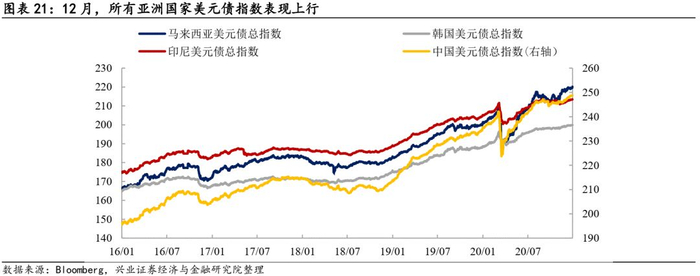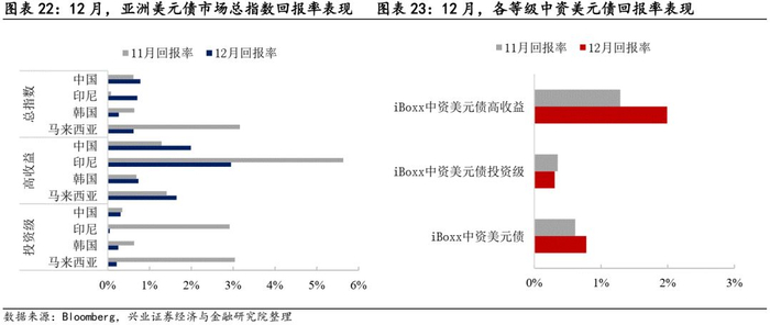 12月亚洲美元债市场回报率表现分化。除中国和印尼外,多亚洲国家美元债总指数回报率环比下行。而从不同等级板块来看,12月份亚洲各国投资级指数回报率均表现下降,其中印尼投资级美元债指数回报率由11月的2.92%下降至0.05%,下降幅度最为显著。12月份亚洲各国高收益级指数除印尼外均环比上升,其中中国高收益级美元债指数回报率由11月的1.29%上升至1.99%,上升幅度最为显著。