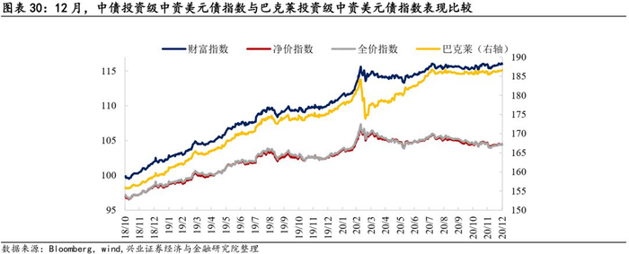 12月,各等级中资美元债指数回报率表现分化。其中投资级中资美元债回报率环比小幅下行0.04%,而总指数与高收益级分别上行0.17%和0.70%。