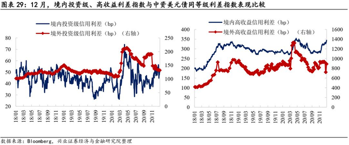 12月境内外利差的差异主要体现在高收益债。投资级信用利差方面,境内利差较上月环比收窄4.22bp,而境外信用利差收窄12.20bp;高收益债利差方面,境内利差较上月环比走阔17.77bp,境外信用利差较上月收窄45.59bp。