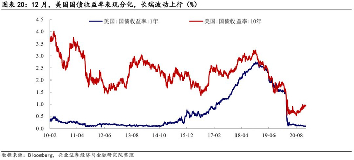 长端美国国债收益率波动调整。1年期美国国债收益率在12月低位波动,由11月末的0.11%下行至12月末的0.10%,较去年年底下行149bp。10年期美国国债收益率本月波动小幅上行,由11月末的0.84%上行至12月末的0.93%,整体较去年年底下降99bp。