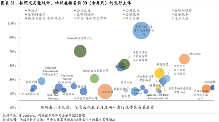 依据以上选取规则并根据可获取的交易规模数据统计,本月活跃度排名前30(含并列)的发行主体分布在14个行业中,其中房地产企业占比四成,依然是交易最活跃的行业;其次是互联网媒体、公用设施、金融服务等行业。个券观察下,相较上月,有11家企业新进入交易量高活跃度名单值得投资者加以关注,包括Sinochem Overseas Capital Co Ltd、绿地全球投资有限公司、方兴资本有限公司、China Overseas Land & Investment Cayman Ltd、新浪微博、爱奇艺、Unigroup International Holdings Ltd、建设银行、Xiaomi Best Time International Ltd、新奥能源和远东宏信。