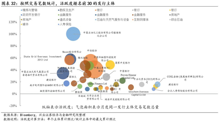 编制方法:统计设计模式如下:1)成交的统计频率为周度数值;(2)活跃个券样本需满足单周累计成交量(/成交笔数)排在当周的成交个券前列 ;(3)按发行主体归纳当月5周中,其所发债券进入活跃券观察样本的累计频次,并将这一指标作为衡量中资美元债发行主体活跃度的参考。