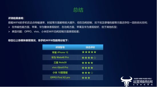 综合以上各模块测试结果,苹果iPhone 12以优异的表现位居榜首。同时报告还显示,搭载WiFi6的手机在近点传输速率、时延等方面都有较大提升,但在功耗控制、抗干扰及穿墙性能等方面还存在一定的优化空间。在传输性能方面,苹果、华为的整体表现较好;功耗方面,苹果及华为表现较好,优于其他机型。