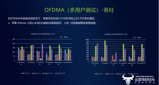 那么OFDMA测试有什么作用呢?它可以考察多用户使用情况下,手机吞吐性能及延时表现。过去的OFDM好比家里手机、电脑、ipad、智能电器都连接了路由器,那设备用网时就会出现排队的情况,如果电脑排在手机前面,使用手机刷剧打游戏时可能就会出现卡顿的问题,而OFDMA可以实现同时传输信号,也就不会出现卡顿的问题了。