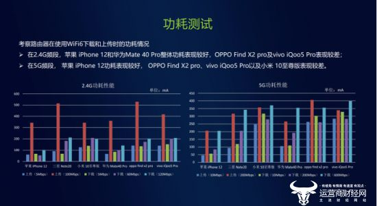 路由器使用WiFi6下载和上传时,在2.4G频段下,苹果 iPhone 12和华为Mate 40 Pro整体功耗表现较好,OPPO Find X2 pro及 iQOO 5 Pro表现较差;在5G频段, 苹果 iPhone 12功耗表现较好, OPPO Find X2 pro、 iQOO 5 Pro以及小米 10至尊版表现较差。