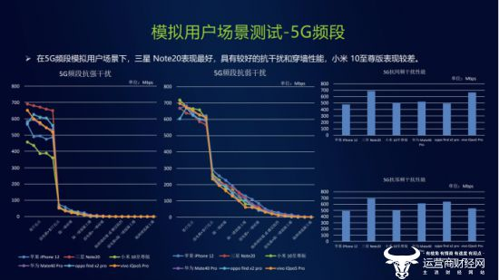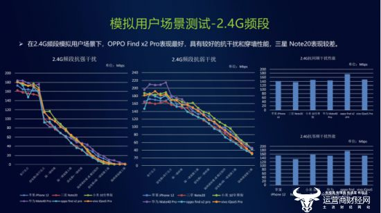 报告结果显示,在2.4G频段模拟用户场景下,OPPO Findx2 Pro表现最好,具有较好的抗干扰和穿墙性能,三星Note 20表现较差。相反在5G频段的模拟用户场景下,三星Note 20表现最好,具有较好的抗干扰和穿墙能力,小米10至尊版表现较差。